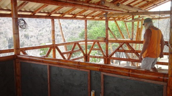 Thursday, Dec 27: Looking from the screened room in the palapa, Doug checks out the balcony in front of the room. The bamboo work on the rails is beautiful.