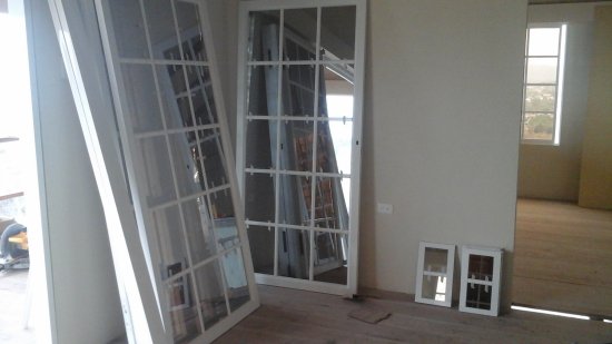 Thursday, Oct 25: Stacked along the wall of the living room are the French doors which will lead to the porch from both living room and bedroom. All windows and doors here in Ecuador are normally made to order to fit whatever size opening you have made.